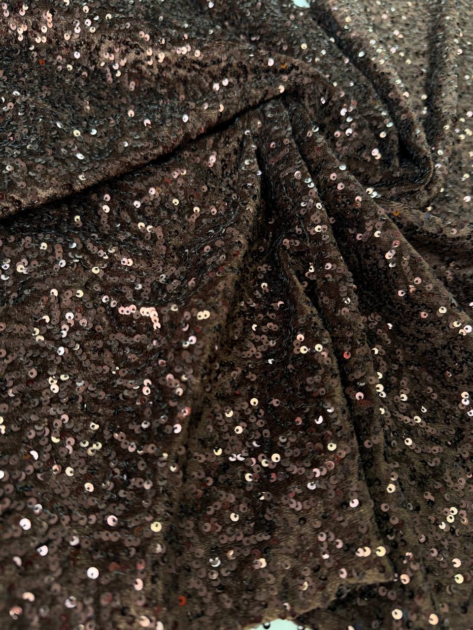 Бархат с пайетками — коричневый – это сочетание двух эффектных материалов, где блеск пайеток контрастирует с мягкой, ворсистой текстурой бархата, создавая образ роскоши. Такое полотно используется для вечерних и праздничных нарядов, таких как платья, топы, пиджаки, а также для украшения аксессуаров. Также можно изготовить мелкие украшения: чокеры или броши. Бархат с пайетками хорошо тянется, при этом держит форму, не садится, не деформируется.