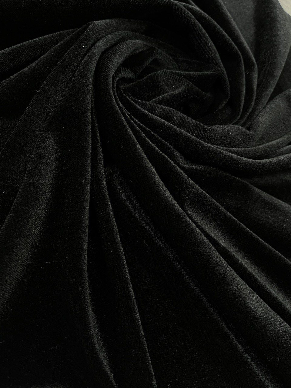 Ткань с блеском и довольно плотным коротким ворсом на лицевой стороне. Изнаночная сторона гладкая. Ткань не садится, не деформируется. Мягкая и пластичная, что позволяет шить огромный ассортимент изделий. Он подойдёт для пошива юбки, платья и наравне с ними будет отлично смотреться в свободном крое спортивного костюма, театральных костюмов, гимнастических костюмов. Также можно изготовить мелкие украшения, использовать в качестве декора. Отлично смотрится в изделиях как основной материал, а также в сочетании. При раскрое и расчете расхода ткани, необходимо учитывать направление ворса.