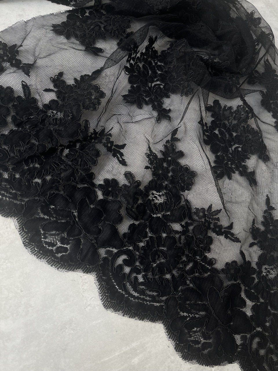 Гипюр на сетке — чёрный. Фестонный край с 2-х сторон. Роскошный вариант для платья, корсета, юбки или отделки.