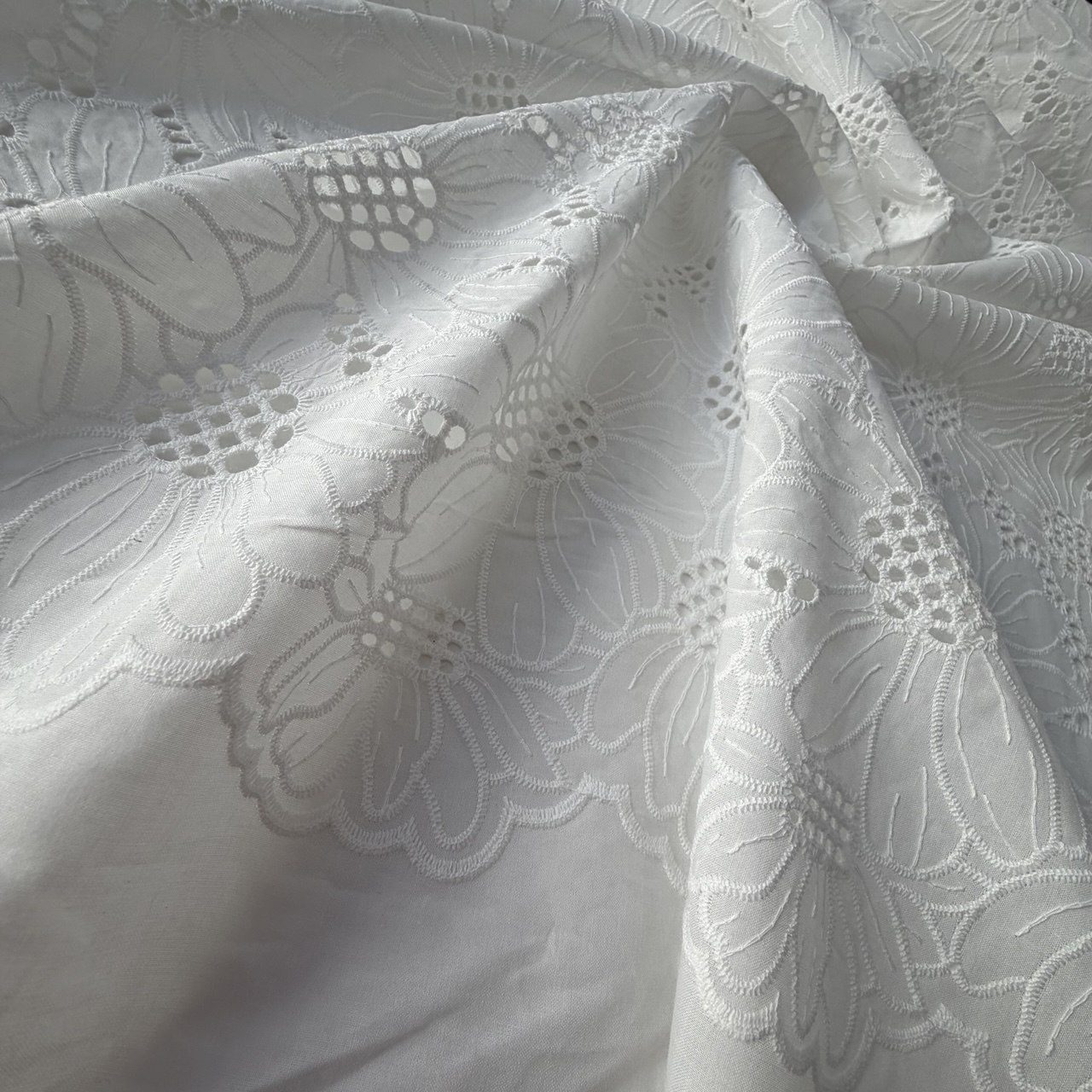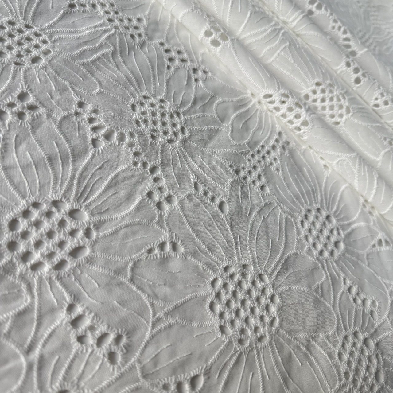 Премиальная ткань в теплом белом оттенке из натурального хлопка с эффектной рельефной вышивкой. Ключевая особенность этой коллекции — крупный растительный принт, выполненный объемной гладью. Размер каждого цветка составляет от 10 до 15 сантиметров, что делает рисунок самодостаточным и идеально подходит для создания акцентных вещей.