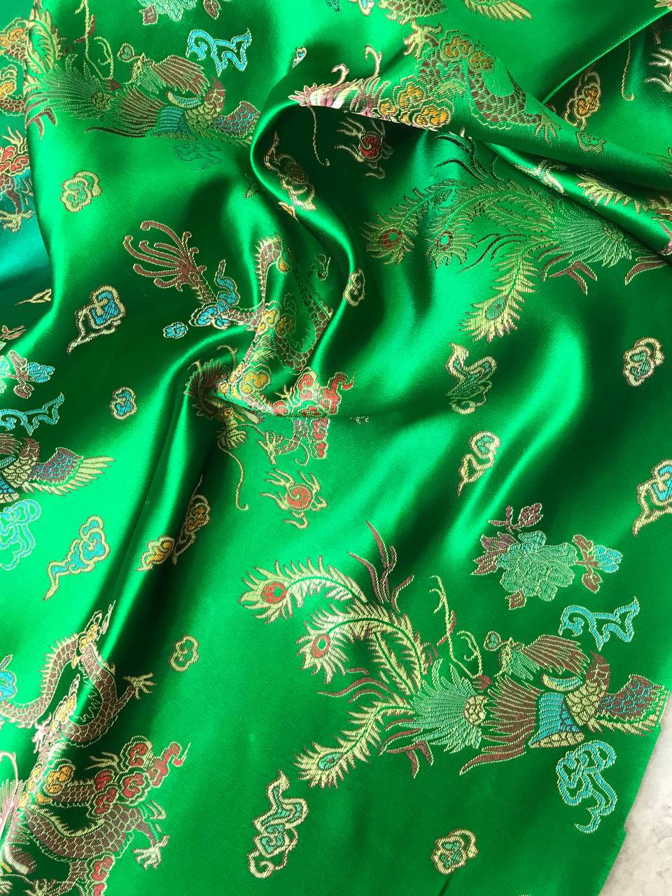 Ткань плотная, не просвечивается, держит форму и объемную складку. Используйте ткань для пошива кимоно, платьев в китайском стиле, халатов и ярких сценических образов.