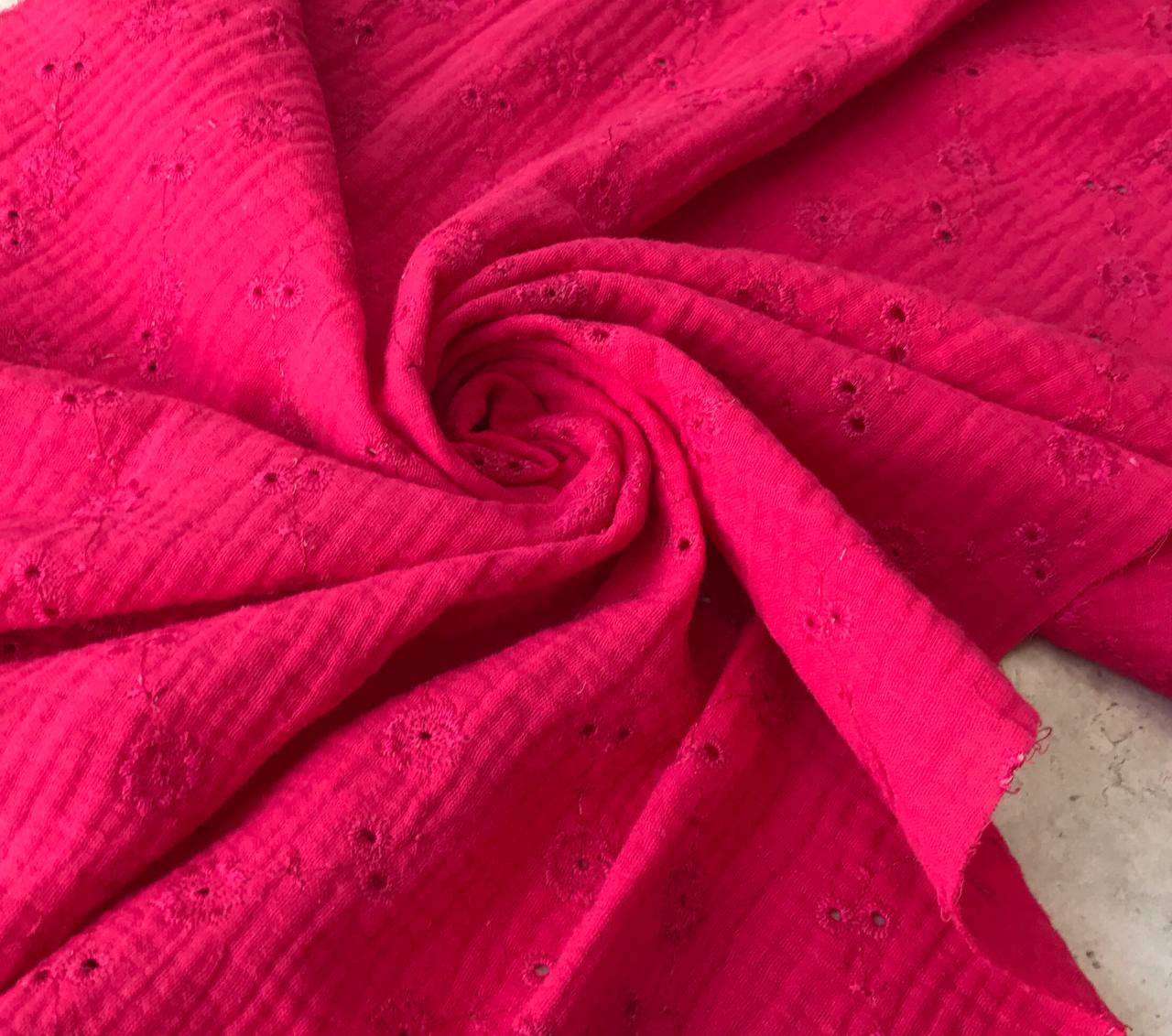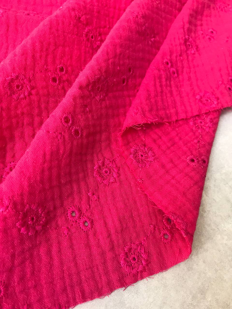 Муслин двухслойный с вышивкой-фуксия. Это очень нежный эко-хлопок для пошива воздушных летних платьев для взрослых и детей. Мужских рубашек, шорт, брюк. Эта натуральная ткань идеальна для летней поры. Муслин не раздражает даже самую чувствительную кожу. Также муслин может нашел широкое применение в домашнем текстиле ( полотенца, пледы и т.д.)