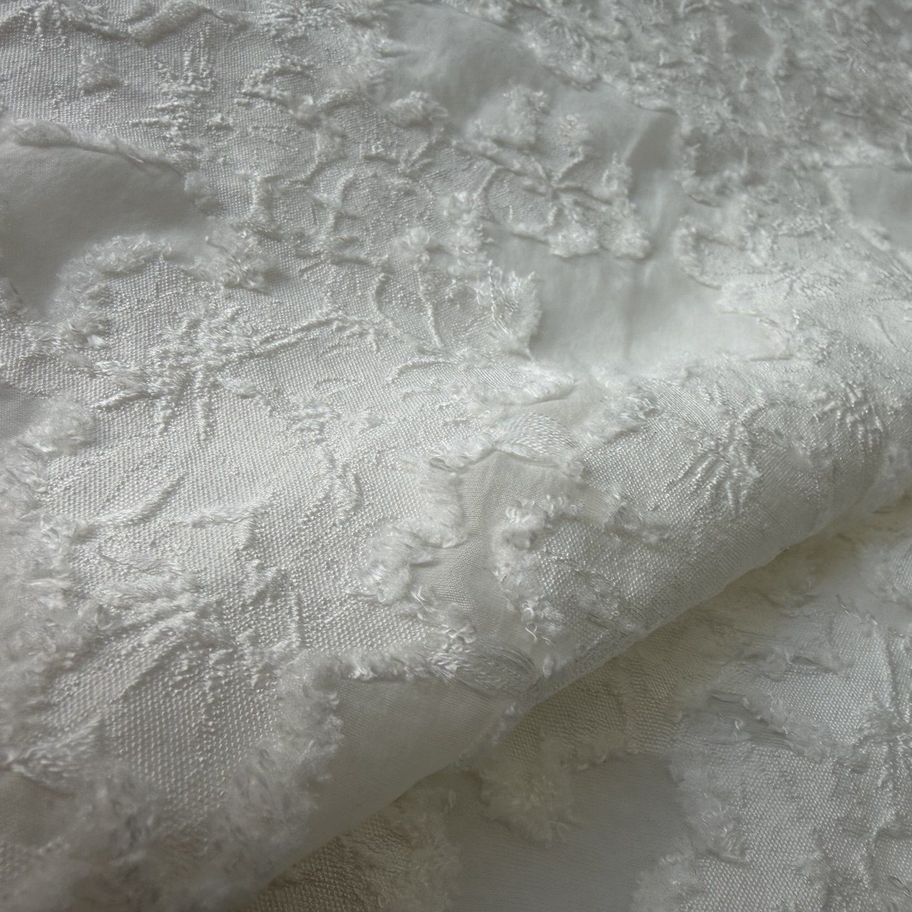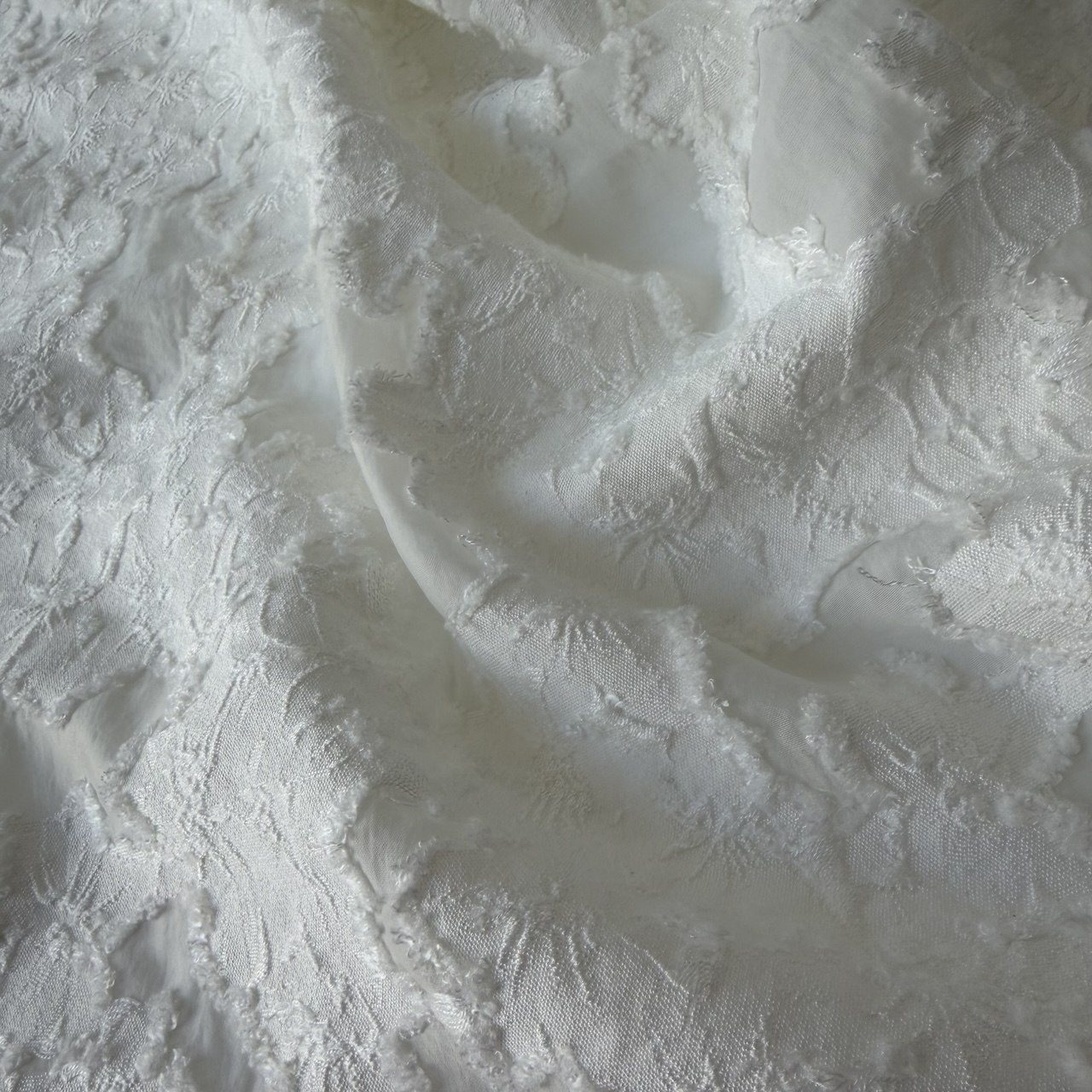 По всему полотну — свободная игра неправильных форм: матовые жаккардовые участки мягко перетекают в полупрозрачные вставки из нейлона, а те, в свою очередь, украшены объемной вышивкой с легким махровым эффектом.
