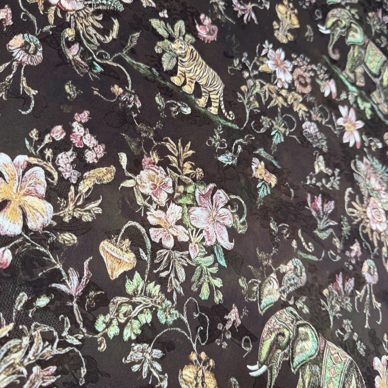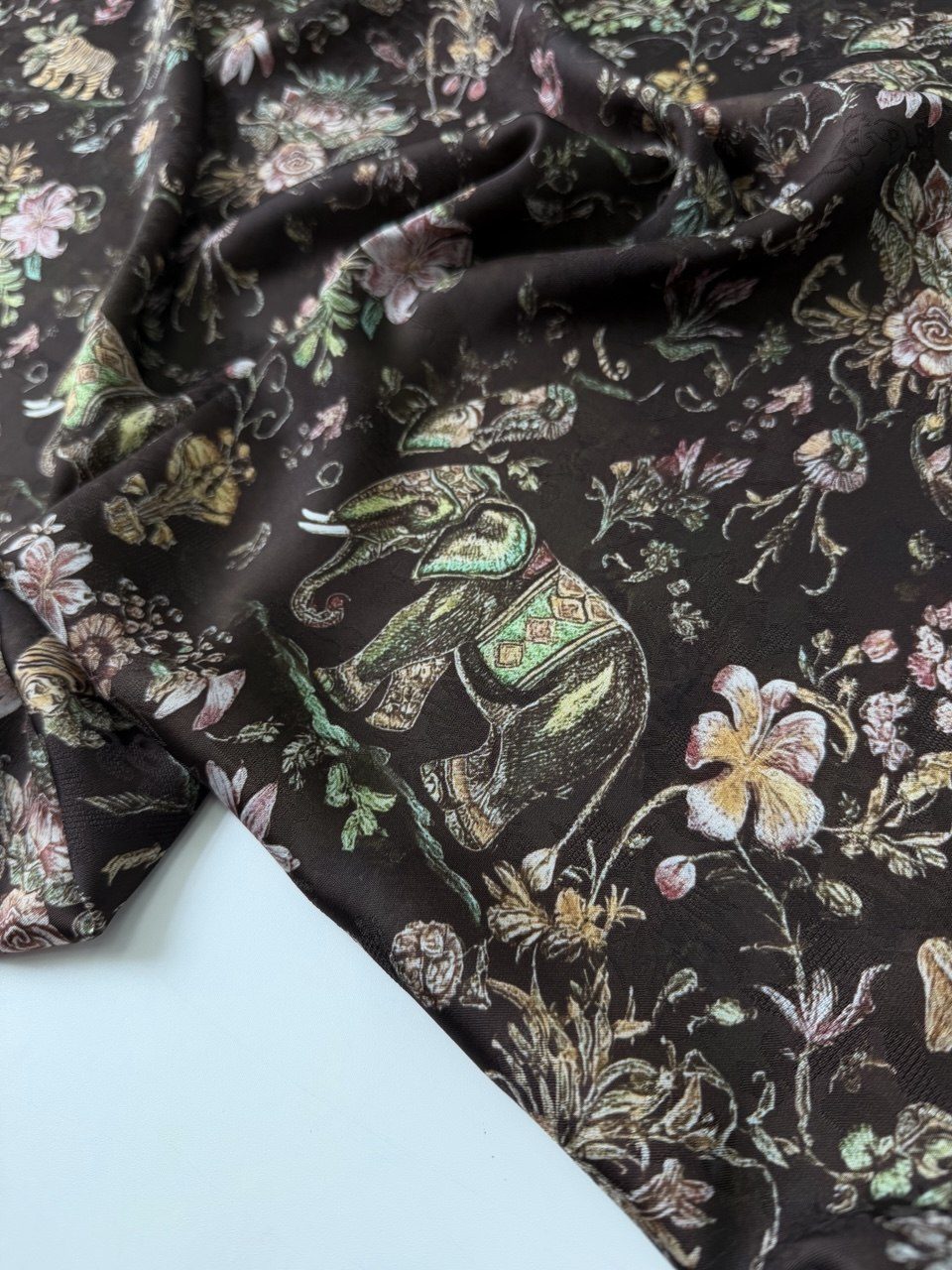 Основной фон — насыщенный глубокий шоколадный оттенок. На нем раскрывается изящный цветочный принт, дополненный более темными фактурными узорами, которые словно «прячутся» в глубине ткани. Особую изюминку придают декоративные элементы — изящные мотивы со слоном и тигром.