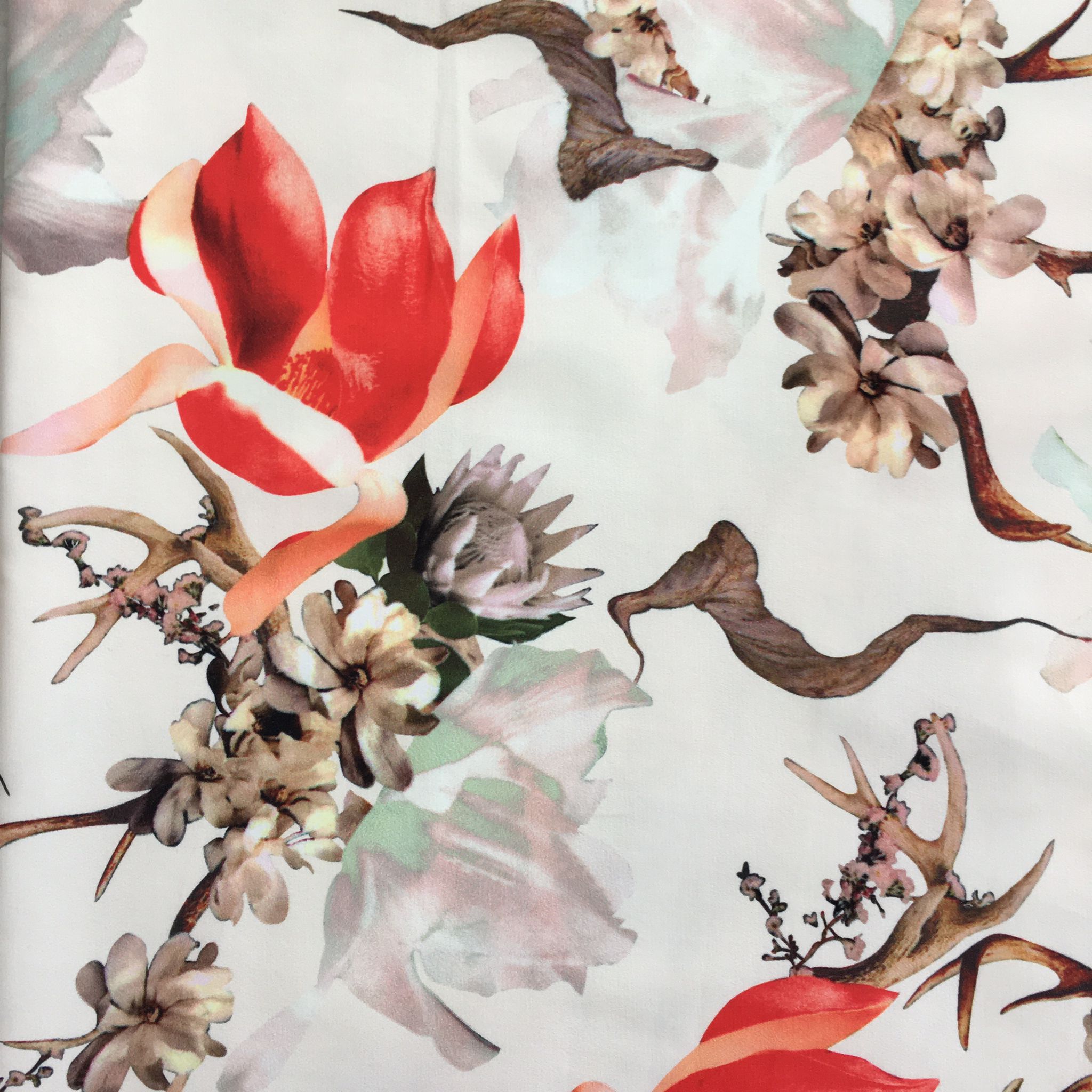 Атлас хлопковый — цветение. Роскошный хлопковый атлас с переливчатым матовым блеском и цветочным принтом.