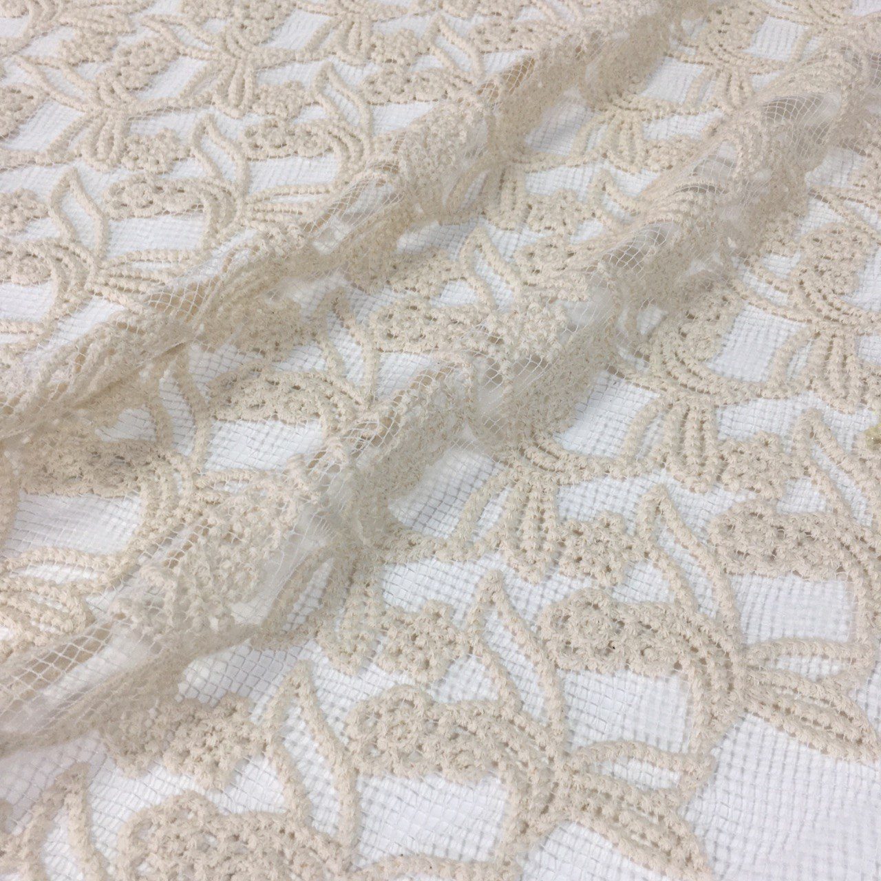 Полотно представляет собой изысканный микс: плотные, объемные кружевные элементы с цветочным орнаментом искусно соединены тончайшими сетчатыми связками. Это создает уникальный рельефный эффект, который выглядит объемно и дорого.