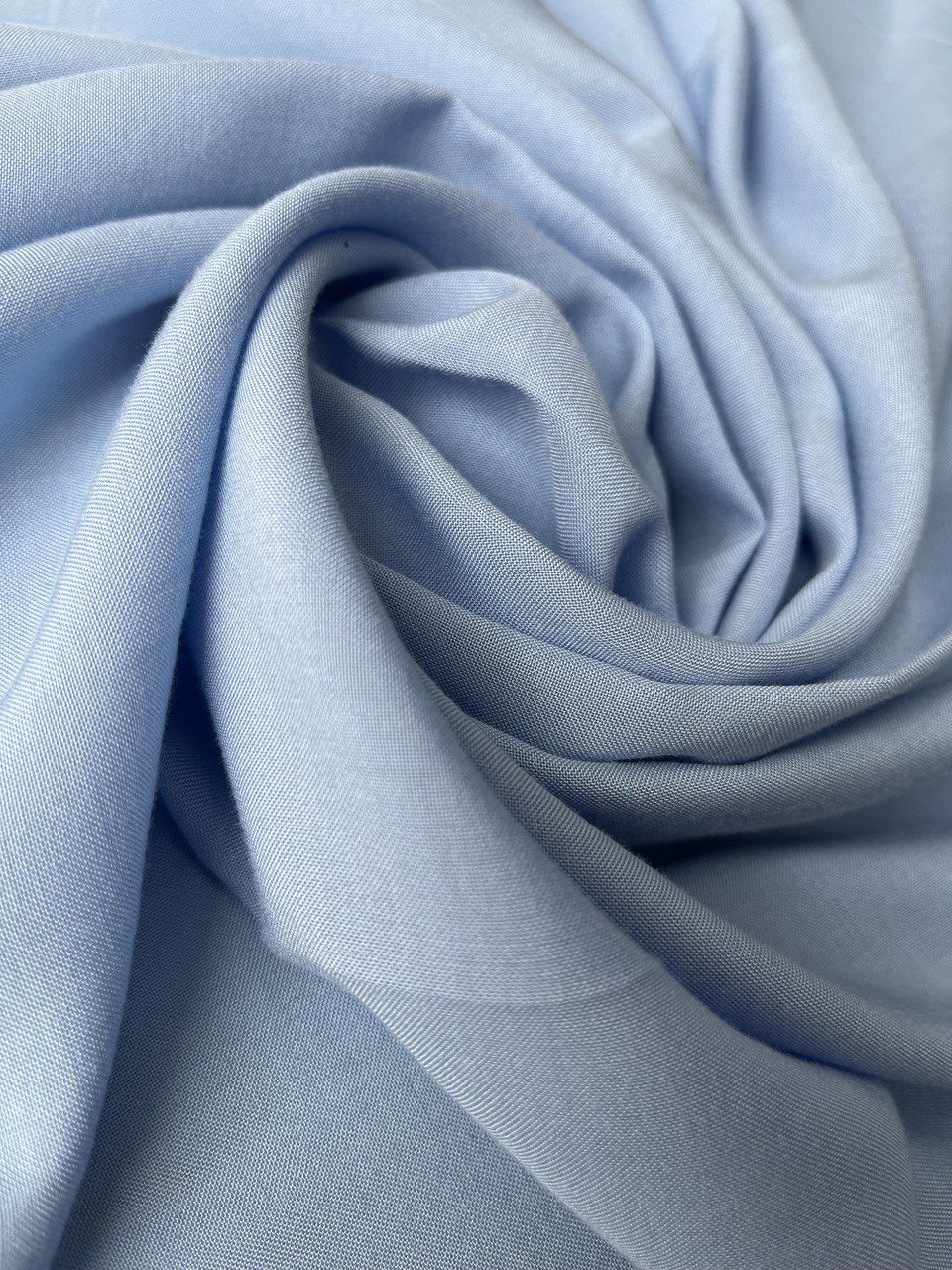 Штапель —небесно-голубой. Ткань средней плотности, отличается мягкостью и легкостью. Ткань отлично драпируется, создавая струящиеся складки. Из штапеля можно сшить не только летящие платья и юбки, но и блузы, топы, туники.